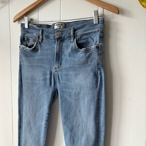 These Agolde skinny jeans in a classic blue hue offer a sleek, high-waisted fit that hugs your legs for a flattering silhouette.