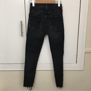 - Washed black denim featuring heavy distressed hem details