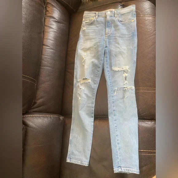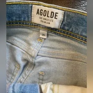 Stylish light blue denim jeans by Agolde. Features classic stitching and premium quality.
