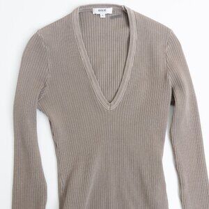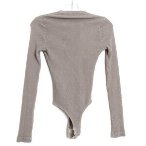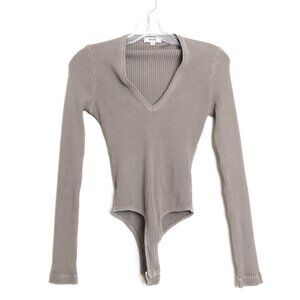 Agolde Tavi Bodysuit Ribbed Jersey Deep V-Neck Long Sleeve Taupe Brown Small