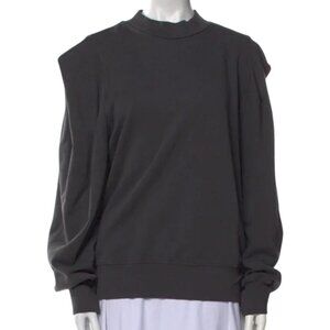 An Agolde dark grey ruched shoulder sweater. This sweater has a high crewneck and dropped shoulders. It features voluminous, ruched detailing on the shoulders that gives the sleeves a gathered look. The cuffs and hem are ribbed. The fit is relaxed and oversized.
