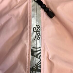 Stay dry and stylish with this pastel pink raincoat, featuring a full-length zipper and a cozy hood for added protection against the elements. The soft material ensures comfort while the contrasting cuffs and hem add a touch of flair.