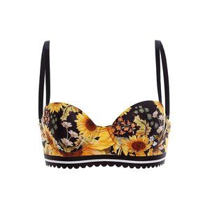 A new silhouette! The lauren bikini top has a classic underwires cup bra with a corset look. It's trimmed with a pleated handmade detailing over the bust and detailed at the bottom with scallop edging with back adjustability and a flattering fit—a localized print inspired by sunflowers. Sunshowers are our way of celebrating 20 years as a brand, a form of praising you, who help us represent our handcrafted devotion around the world. A hand-embroidered lifetime passage, celebrating intuition, feminine energy, sisterhood, and our favorite story. This piece is perfect for all bodies made with 81% recycled polyester - 19% elastane.