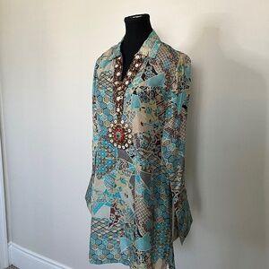 Tunic by Ashish Pandey with Beautiful beadwork designed to look like a necklace... There are two tiny holes on the Tunic, one is on the left upper sleeve and the other is front upper left, hardly noticeable. Please see in images