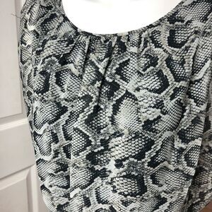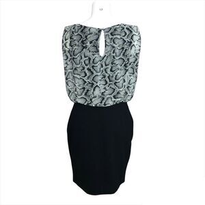 Pre owned. Excellent condition. Bodycon black dress. Top covered in black & gray snakeskin chiffon. Side zipper. Rayon, nylon, spandex & polyester
