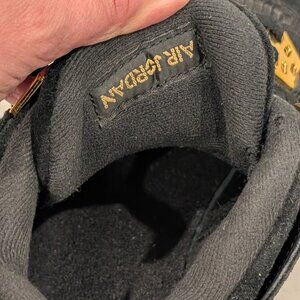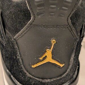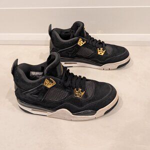 Released in February 2017, the Air Jordan 4 Retro GS 'Royalty' features a premium black suede upper, metallic gold accents, and a white and black rubber sole.