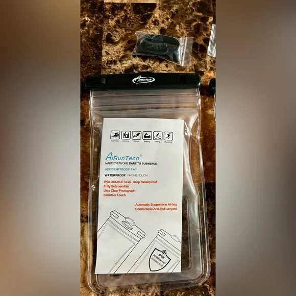 Waterproof phone pouch by AirRunTech. Features IP68 double seal and ultra-clear photograph capability. Includes automatic suspension airbag and anti-lost lanyard.