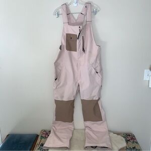 This jumpsuit features a charming pink and tan color scheme with a classic bib front. Made from a sturdy fabric, it offers both comfort and style for active wear. The contrasting panels enhance its playful appeal.