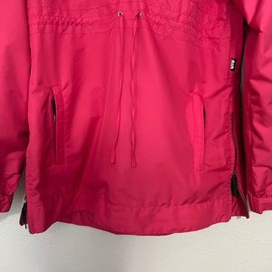 Old school air blaster pull over shell jacket. Zippered front pockets and pull string chest. Button up collar. Dusty pink. Smoke free.