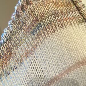 KNIT Larger on the front (not damaged) loose knit- Few pulled threads - on the outside - I pulled to the other side- picture - minor - pulled threads back easily.