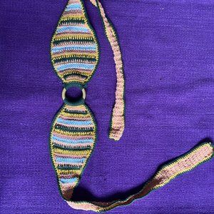 Inspired by the Sumbanese Ikat colouring, the tones of our Humba multi in stripe crochet pattern. Featuring our signature bamboo ring. 70's inspired cut.