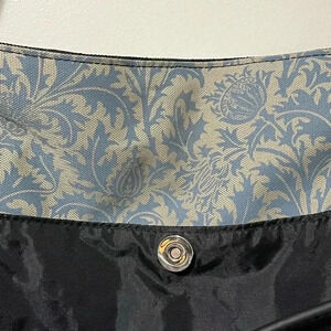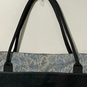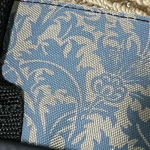 Only signs of wear are two spots on bottom (see pics). Waterproof bottom material. Water resistant lining. Magnetic snaps. Solid woven handles. Woven material with embroidered logo. Very durable. Easy to clean. Great for the beach or vacation. Blue & tan floral pattern top panel. Snap closure top. Snap closure side pockets. Interior zipper pocket. This style no longer available.