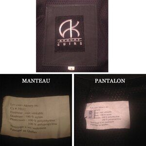 Sleek black leather jacket and pants set by Akoury. Perfect for motorcycle enthusiasts. Stylish and durable design.