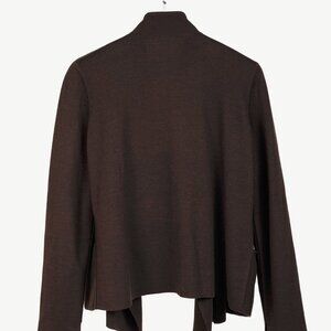 Made in Romania, this reversible cardigan from Akris's 2013 Pre-Fall and Winter collection is crafted with a soft brown cashmere and silk knit, and is designed with stripes on one side while being solid on the other. It features long sleeves slit cuffs, an open waterfall front, and patch pockets on the solid side.