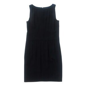 Sleeveless sheath dress. Cocktail midi length. Round neckline. Pleated gathering on the front and back waist. Darts at bust. Two front pockets. Zip closure. Fully lined. Made in Switzerland. Brand new with tags, no signs of wear. Similar styles retail for around $2000 CAD.