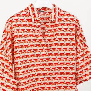 Made in Romania, this blouse from Akris Punto's 2024 Resort collection is crafted in an off-white cotton satin, and is printed with an allover pelican dot print in orange and red hues. It features 3/4 sleeves, drop shoulders, a Kent collar, a polo placket with a hidden snap closure, a loose fit through the bodice, side slits, and a hip-length hem.
