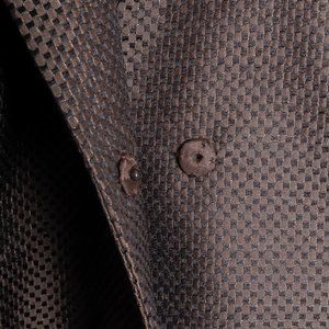 A brown and black tailored jacket composed of a blend of silk and wool from Akris featuring notched lapels, light shoulder pads, two front snap-button closures, a curved hem, three piped pockets at the waist, and a single piped pocket over the left breast. The interior of the jacket is fully lined in black silk.