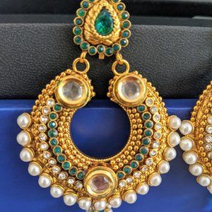 These beautiful earrings are studded with teal blue and white zircon crystals, lab synthesized pearls and white kundan stones. They are absolutely stunning! Worn once for a wedding. There are no missing stones or any damage.