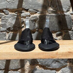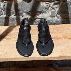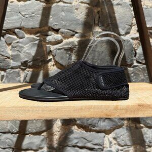 Alaïa Black Fishnet Mesh Thong Sandals. Flat sandals featuring a thong toe and a wide fishnet mesh upper that wraps the foot. Adjustable velcro strap at the back heel, embellished with Alaïa logo. Flat black rubber outsoles with circular and linear textured tread patterns. Made in Italy. Comes as is. CURRENT RETAIL: 1150$ CAD. (October 2025) SIZE: 37 IT - 7 US. Please refer to measurements. Insole: 9.5" Outsole: 9.5" Total height: 2.5" MATERIAL(S): Technical mesh upper, leather footbed, rubber outsole. CONDITION: New without box, never worn and in excellent condition. Minimal signs of wear consistent with handling and trying on. No visible defects. Please refer to the pictures and measurements. Feel free to inquire for additional information prior to purchase.
