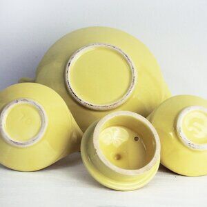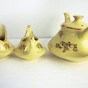 Mid century modern tea set in a soft, buttery pale yellow with gold trim. Vintage Aladdin style with three pieces: teapot, cream, and sugar are all included.