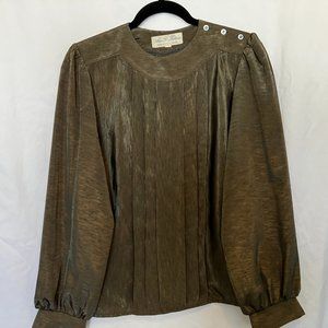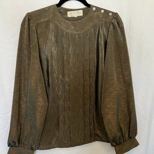 Yes it shimmers, like a raw silk taffeta. It's army green with darker flecks. Pleated front with shoulder buttons. Made in the 80's so made with better quality material and craftmanship. The label is the only place that shows wear from the hand washing.