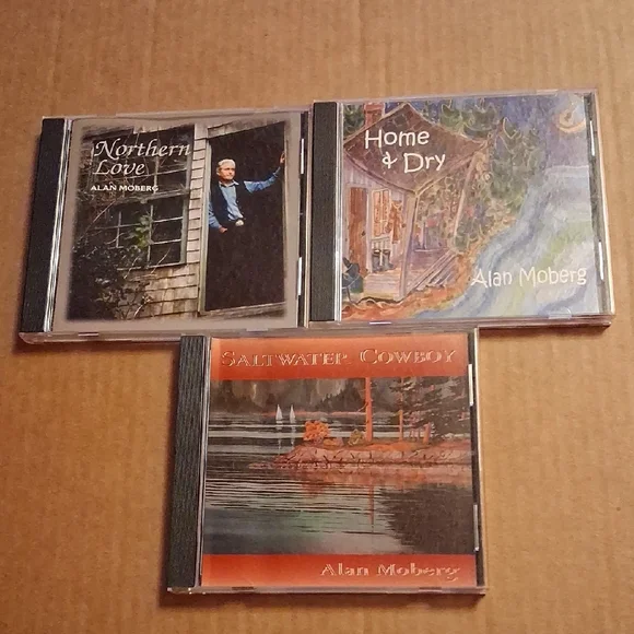 Set of three Alan Moberg CDs featuring Northern Love, Home & Dry, and Saltwater Cowboy. Perfect for music enthusiasts.