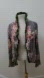 Wild and wonderful Alberto Makali knit blazer. An array of floral and jungle animals roam about and are alluded to on this subdued yet colorful artistic screen print. Blazer is v-neck. Features a decorative large 1-3/8" single button and single large snap closure. Collar, front closure and bottom edge accented with double layer ruffle of olive green velvet and soft lace. Fully lined with crinkle polyester-viscose blend.