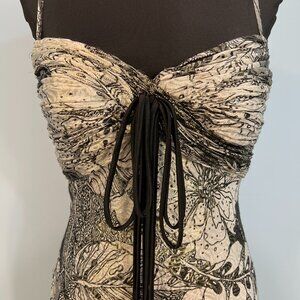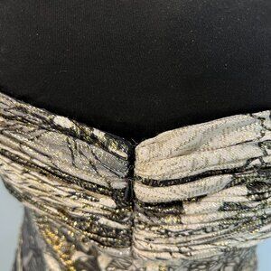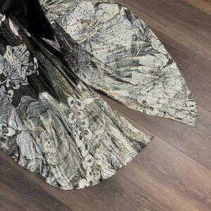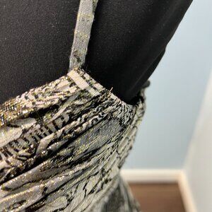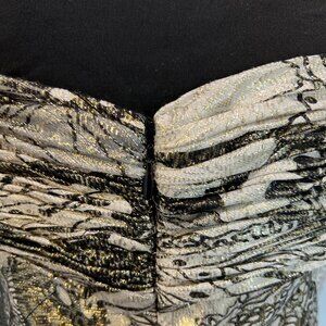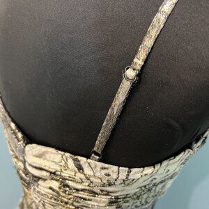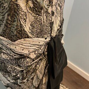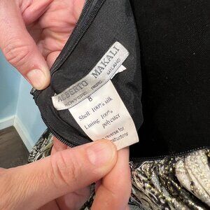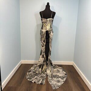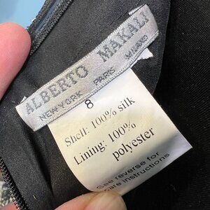 Alberto Makali size 8 glamorous evening dress. 100% silk exterior with silver and gold threading, soft polyester satin lining. Features include ribbon detailing at bust and back. Long train. Zipper and clasp closure. Adjustible shoulder straps.