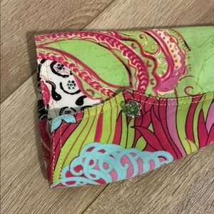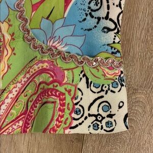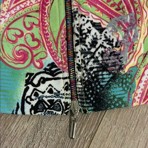 Vibrant paisley design. Features a mix of colors. Zipper closure. Perfect for a bold look.