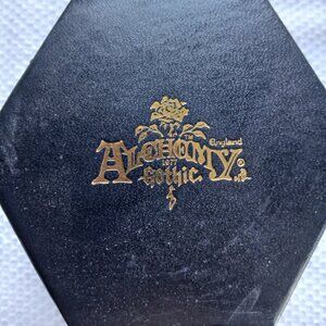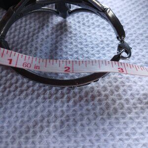 Alchemy Gothic bracelt with lobster clasp. This a very large piece for a small wrist. I would say it fits someone up to 6.5", maybe 7" if you like your bracelets snug. It has rhinestones set within the cross as well as the back of band. Pewter. The presentation box is intact and in great shape. The bracelet is held in place by a velvet pillow. This piece is from 2006.