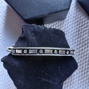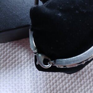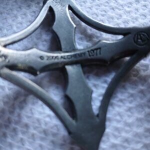 Alchemy Gothic bracelt with lobster clasp. This a very large piece for a small wrist. I would say it fits someone up to 6.5", maybe 7" if you like your bracelts snug. It has rhinestones set within the cross as well as the back of band. Pewter. The presentation box is intact and in great shape. The bracelet is held in place by a velvet pillow. This piece is from 2006.