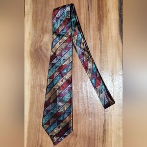 Elevate your style with this geometric patterned tie. Featuring a blend of rich colors, it's perfect for any formal occasion. Woven design.