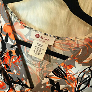 Elevate your style with this vibrant Aldila Colorful Curved Hem Mini Dress Tunic. Its stunning orange and black print creates a bold, feminine look.
