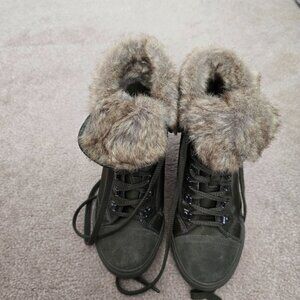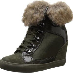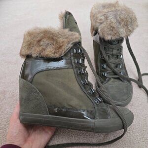Aldo Army Green Faux Fur Wedge Sneaker / Ankle Bootie - Size 8.5