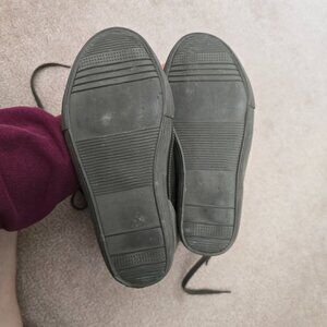 Army green / olive green color. Round toe, suede/fabric accents, canvas/patent leather mixed upper.