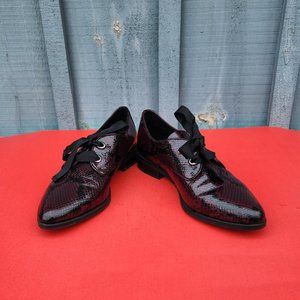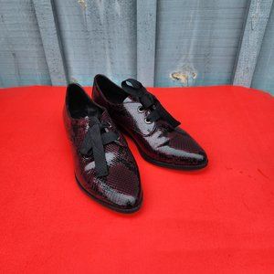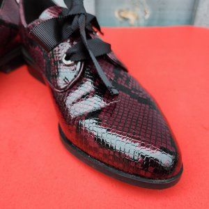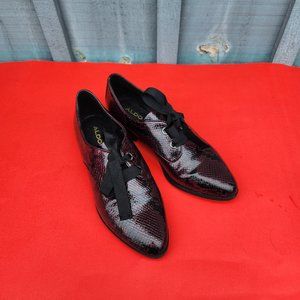 Beautiful like new Size 7 Aldo Berry color snakeskin look leather shoes with black ribbon laces.