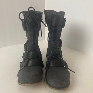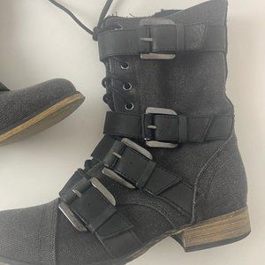 Stylish combat boots with buckle details. Lace-up design. Durable and trendy.