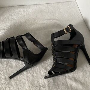 Elevate your style with these sophisticated black gladiator heels from Aldo. Featuring a sleek cage-like design with multiple smooth leather straps, these high-heeled sandals offer a chic and versatile look. The slim 4-5 inch heel and open-toe design make them perfect for dressy occasions.
