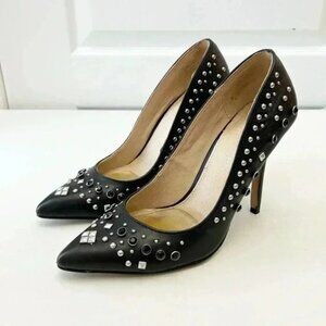 Aldo Black Leather Pumps Pointed Toe High Heel Rhinestone Studded Stilettos 7.5