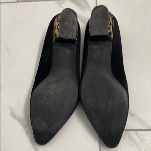 Black velvet ALDO loafers with golden details on heels. The shoes have a classic loafer design with a pointed toe and a low heel. The golden elephant detail on the heel adds a unique and stylish touch. Size 7.5 B