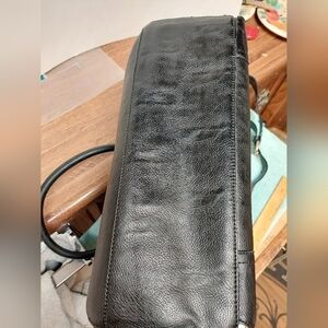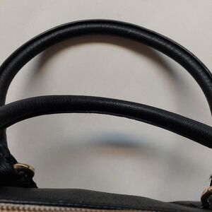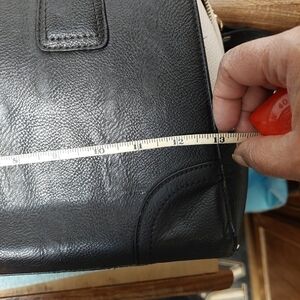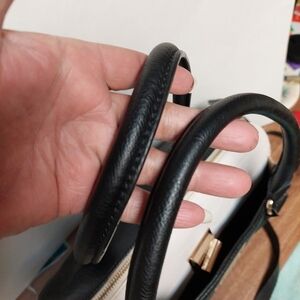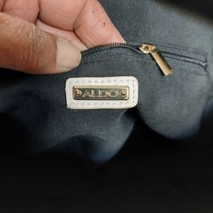 Aldo Black & White Satchel Bag. Off-white sides. Classic shape. Little tarnish on turn key front latch which opens to side compartment. Zippered top closure. Looks like some repairs were done on edges but not really noticeable. See photos. Note not all photos were able to b added. Interior excellent shape.