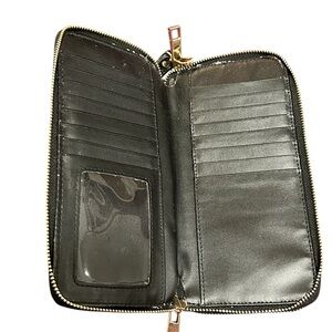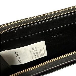 Sleek black wristlet wallet by Aldo. Features gold accents and a convenient strap.