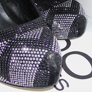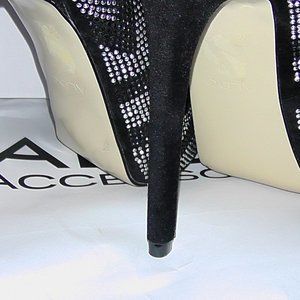 Beautiful, worn twice. Perfect with jeans/dress up events! Black and Silver metallic geometrical studded design. Black velvet covered 5 1/2" heels. Inside covered platform front. Semi rounded toe. Sexy and elegant!