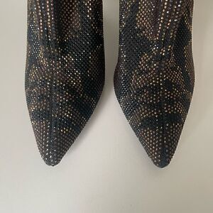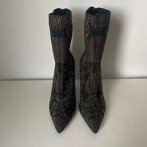Aldo Boots Black Rhinestone Glam Heels Size 9 Pointy Toe Bronze Stretch NEW