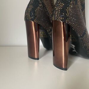 Aldo Boots Black Rhinestone Glam Heels Size 9 Pointy Toe Bronze Stretch NEW