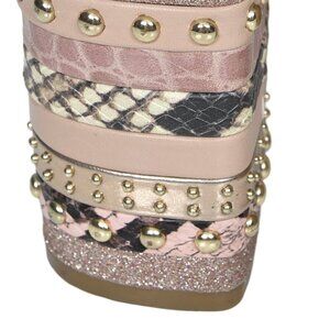 Elevated by an exaggerated platform and block heel, these ankle strap sandals are a bold take on the boho look. Embellished with rows of metallic studs for texture and shine, let them lend an edgy slant to joggers, denim or dresses.