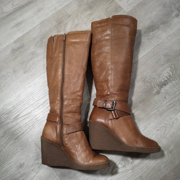 Aldo Ladies Size 7 Brown Knee High Side Zip Lined Faux Leather Wedge Heel Boots