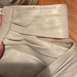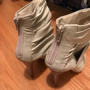 Gorgeous leather booties by Aldo. Light beige/tan colour. Wooden heels. Open toe style. Genuine leather. Euro size 40. Never worn, but I did place an anti-slip pad on the bottoms (as I was planning to wear these, but they no longer fit me ;-). Zippers on the back of heel for easy on/off. Please note there are a couple of small oxidized glue marks (see pics), but not really noticeable. Smoke free home. No original box, but will ship in a different box.