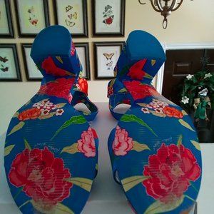 Cute royal blue satin sandals with floral pattern on both the upper and soles of the shoe