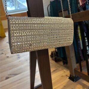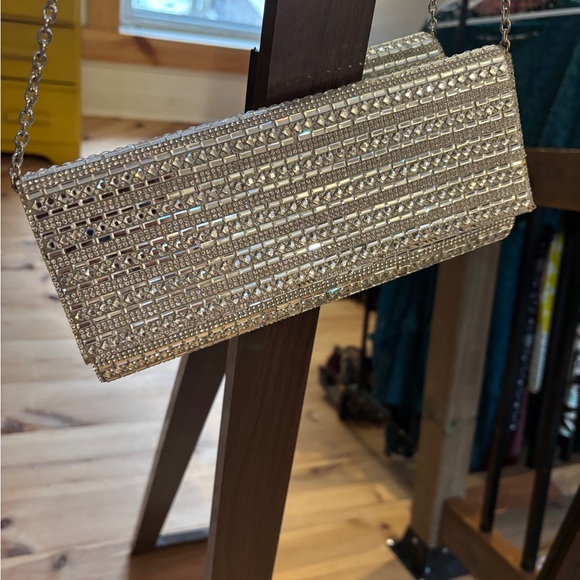 Chic metallic clutch with shimmering accents. Ideal for special occasions. It’s is missing a few tiny rhinestones (pictured). This is barely noticeable but I have included some extra rhinestones to make a repair if desired. This is a very sweet clutch at a very sweet price!